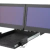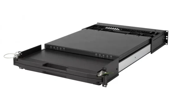 The RMDDU is a rugged 2U rack-mount drawer with dual-screen LCD monitors The displays fold together, rotate, and slide in for storage.